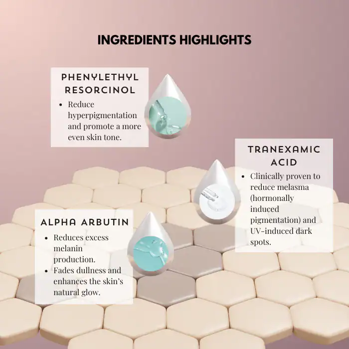 Aqua, Butylene glycol, Glycerin, Panthenol, Alpha-arbutin, Niacinamide, Tranexamic acid, Palmitoyl tetrapeptide-7, 1,2-Hexanediol, Polysorbate 20, Panax ginseng root extract, P-Hydroxyacetophenone, Dipotassium glycyrrhizate, Phenylethyl resorci nol, Bakuchiol, Sodium hyaluronate, Mussel extract.